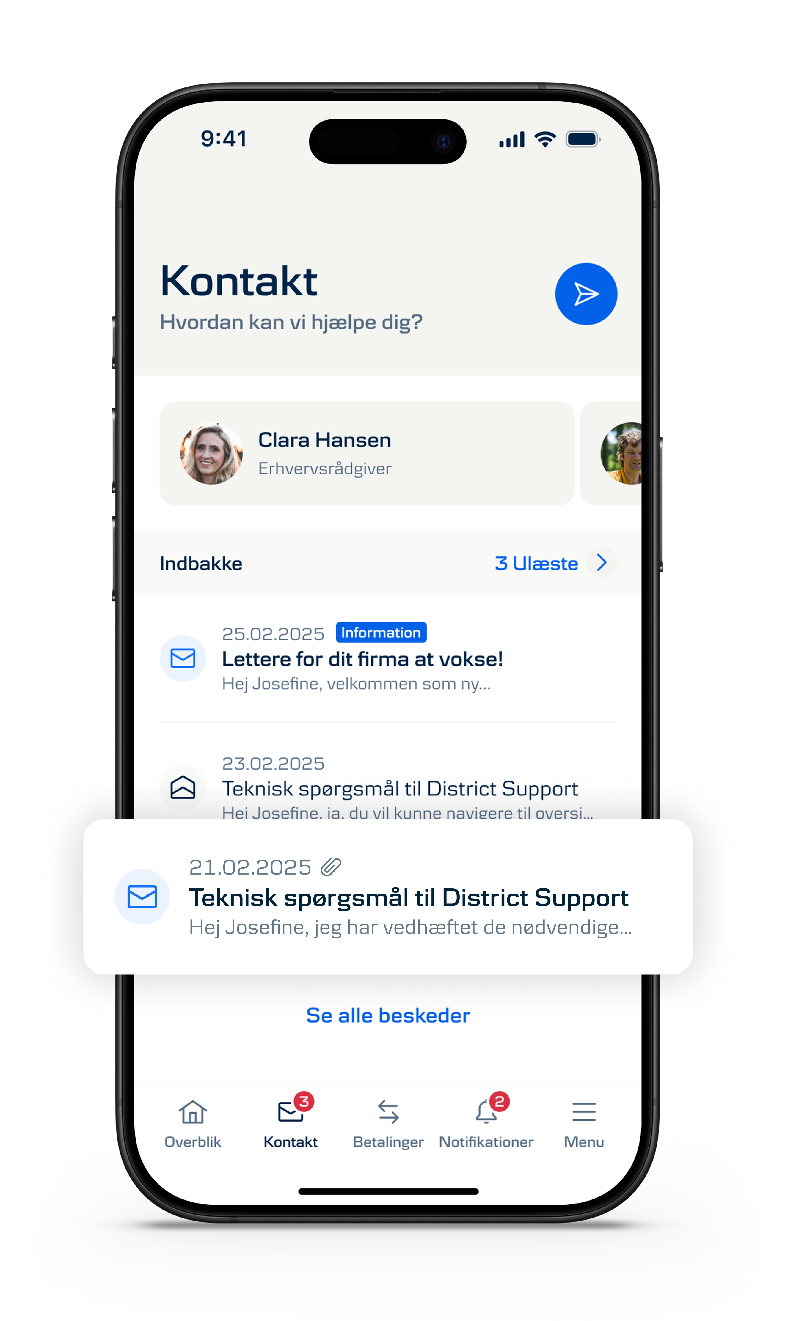 Send oss en melding direkte i appen for å få hjelp.