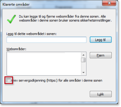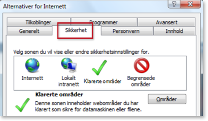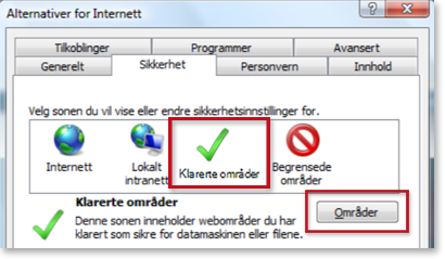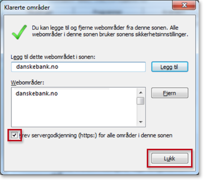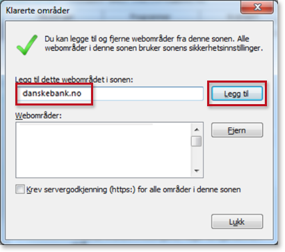 Når du bruker Internet Explorer er det nødvendig å legge til vårt domene under klarerte områder i Internet Explorer før du kan ta i bruk Danske Bank File Plug-In.