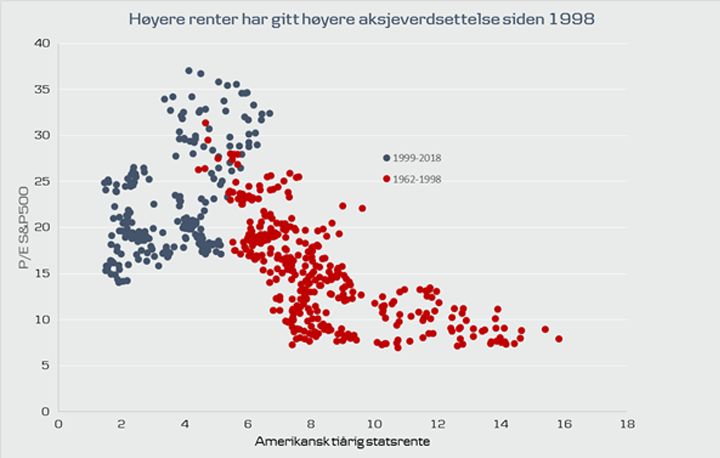 Et dypdykk i historiske tall viser at en slik generalisering mellom renter og aksjekurser likevel ikke holder helt vann. I figuren under ser vi P/E-forholdet (pris per aksje / forventet inntjening per aksje) for den amerikanske S&P 500-indeksen, sett i forhold til renten på statsobligasjoner i USA med 10-års løpetid. Disse månedlige dataene er inndelt i to grupper; data henholdsvis før 1998 (røde prikker) og etter 1998 (blå prikker). I perioden fra 1962 til 1998 ser vi at den nevnte sammenhengen stemmer godt; med tendensen til at renteoppgang gir lavere prising av aksjer. De blå prikkene (1998-2018) viser derimot det motsatte; at høyere renter har ført til høyere aksjeverdsettelse de siste 20 årene. Årsaken er at i perioden etter 1998, så har renteøkninger normalt vært drevet av høyere økonomisk vekst, og ikke uønsket inflasjon (kjent fenomen på 1970-tallet). Når økonomien blir sunnere løftes investorenes forventninger til lønnsomheten i selskapene og viljen til å ta risiko stiger, noe som medfører at kravet om kompensasjon for å ta risiko i aksjemarkedet (risikopremien) faller. Dermed ser vi konturene av en interessant konklusjon; så fremt rentene stiger mindre enn risikopremien faller, vil dette isolert sett kunne føre til høyere, og ikke lavere, aksjekurser!