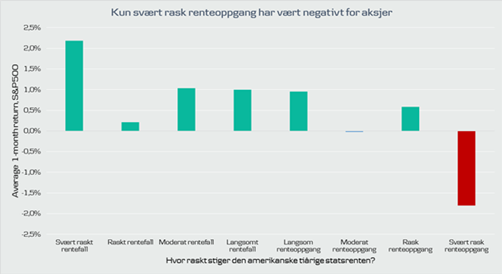 Spesielt hastigheten på renteoppgangen spiller en rolle for hvordan aksjemarkedet reagerer. Figuren under viser månedlig kursendring i S&P 500 sammenlignet med månedlige renteendringer (tiårig amerikansk statsrente) med ulik hastighet. Fallende renter har ført til positiv aksjeavkastning uavhengig av tempo, mens stigende renter absorberes av aksjemarkedet så fremt det skjer i et moderat tempo. Stiger rentene derimot brått har dette sammenfalt med negativ aksjeavkastning. Tidligere har slike kursfall gjerne blitt utløst av at investorene har hatt for lave forventninger til fremtidig renteoppgang, noe som har holdt aksjekursene på et kunstig høyt nivå, helt frem til renteforventningene ble mer realistiske.