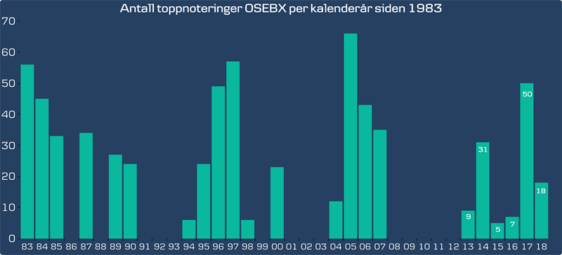 Oslo Børs' hovedaksjeindeks har nå hatt 660 toppnoteringer siden 1983, eller i gjennomsnitt 18 hvert år. Gjennom 2017 hadde vi for eksempel hele 50 toppnoteringer. Dermed har de 900 indekspoengene som nå er nådd kun en symbolsk verdi, da dette er helt normalt i aksjemarkedet. Det har ingen betydning verken i positiv eller negativ retning for utviklingen videre.