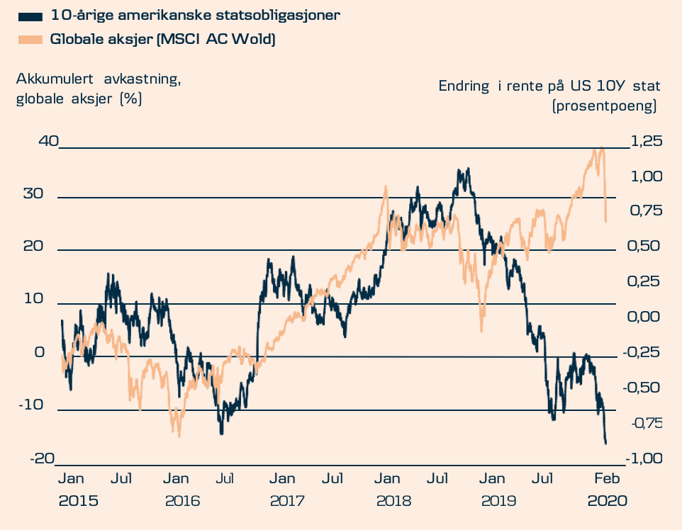 Mens aksjemarkedene inntil nylig hadde signalisert optimisme og framtidstro med kursstigninger i 2020, har de fallende rentene signalisert større skepsis til den økonomiske utviklingen. Tendensen var en fortsettelse av mønsteret som vi så i deler av 2019. Historisk avkastning er ikke en pålitelig indikator på framtidig avkastning.