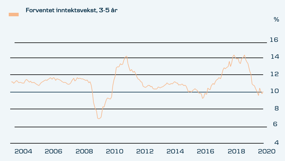 Analytikernes forventninger til bedriftenes inntjening de neste 3-5 årene ligger for øyeblikket på et lavt nivå historisk sett. De langsiktige inntjeningsfor- ventningene er ofte en vesentlig faktor for verdsettelsen av aksjer, og her ser vi et potensial for overraskelser på den positive siden hvis økonomien utvikler seg stabilt.