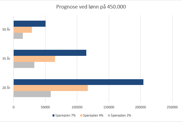 Se regneeksempel under, som viser hvor mye økt pensjonsinntekt man får med høyere sparesats, avhengig av om man starter pensjonssparingen ved fylte 20, 35 eller 50 år.