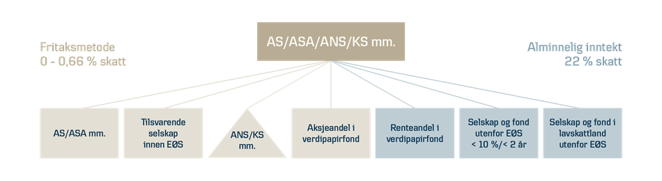 Fritaksmetoden gjelder for investeringer i norske selskap som AS, ASA, egenkapitalbevis i sparebank, samt aksjeandeler i verdipapirfond.