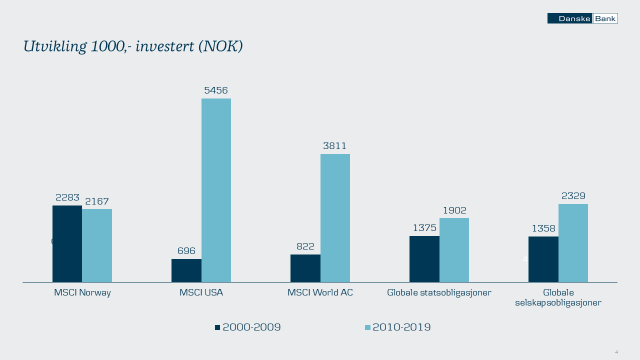Aksjer: Globale aksjer målt ved MSCI World All-Countries har gitt 147 prosent avkastning i lokal valuta, inkludert reinvesterte utbytter, de siste ti årene – tilsvarende 9,5 prosent i gjennomsnitt per år. Særlig har amerikanske aksjer ledet an med eksempelvis S&P 500 opp 255 prosent eller 13,5 prosent annualisert i perioden – trukket opp av digitale giganter som Amazon, Facebook, Apple og Alphabet (Google). Oslo Børs har steget 150 prosent samlet sett eller 9,5 prosent per år, mens europeiske og emerging markets-aksjer har gitt en annualisert avkastning på henholdsvis 8,5 og 6,3 prosent.