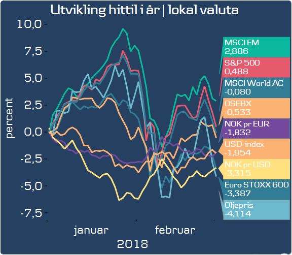 Gullhår-klimaet med akselererende økonomisk vekst og lave renter ga oss et perfekt aksjeklima gjennom 2017. Nå står en sterk økonomi og høy selskapsinntjening igjen som «ensomme» aksjedrivere. Stigende renter gjør investorene litt mer nervøse enn tidligere. Makroøkonomiske eller inntjeningsrelaterte skuffelser, og/eller uventede rentehopp, vil gi økt markedsturbulens. Vi forventer positiv, men lavere og mer urolig aksjeavkastning fremover.
