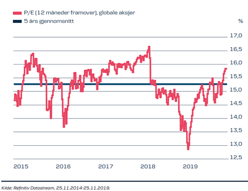 Etter den siste tidens kursoppgang er globale aksjer nå priset over gjennomsnittlig nivå de siste fem årene, målt ved P/E (basert på forventet inntjening neste 12 måneder) – dvs. prisen man betaler som investor for den forventede inntjeningen i selskapene de kommende 12 månedene. Aksjene er dermed ikke billige, men etter vår mening er de fortsatt et attraktivt alternativ til den lavere forventede avkastningen fra obligasjoner.