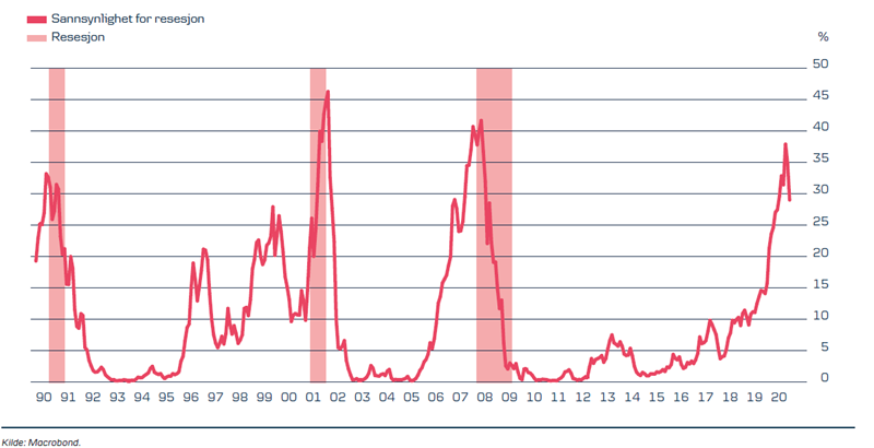 Federal Reserve Bank of New York (regional avdeling av den amerikanske sentralbanken) vurderer løpende risikoen for resesjon i USA de kommende 12 månedene, basert på forskjellen mellom korte og lange amerikanske renter (henholdsvis 3 måneder og 10 år). Historisk sett har utviklingen i forskjellen mellom disse rentene vært en av de mest pålitelige indikatorene på en forestående resesjon. De siste månedene har risikoen avtatt, men ligger fortsatt på et høyt nivå. Hvis de økonomiske nøkkeltallene fortsetter med å peke mot en stabilisering i økonomien, kan det ytterligere redusere frykten for resesjon og støtte opp under aksjekursene.