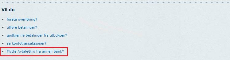 Logg inn i Danske Bank nettbank | Velg Betaling og avtaler | Velg Se og endre avtalegiro | Velg Flytte Avtalegiro fra annen bank