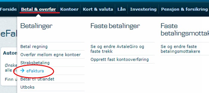 1. Logg inn i nettbank -> Betal & overfør -> eFaktura